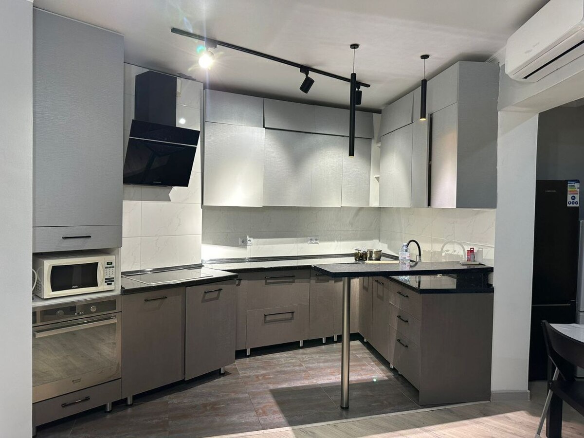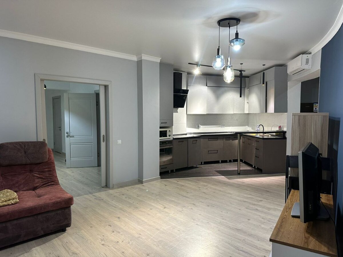 Квартира полностью меблирована и оборудована всей необходимой техникой. Просторная кухня с современным кухонным гарнитуром, индукционной плитой, вытяжкой, духовым шкафом, микроволновкой, холодильником и вместительными шкафами. Уютная гостиная с большим диваном и телевизором. Две спальные комнаты. В квартире два полноценных санузла: один с душем, второй с джакузи.
