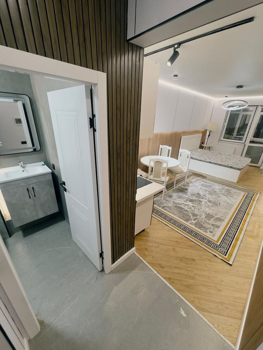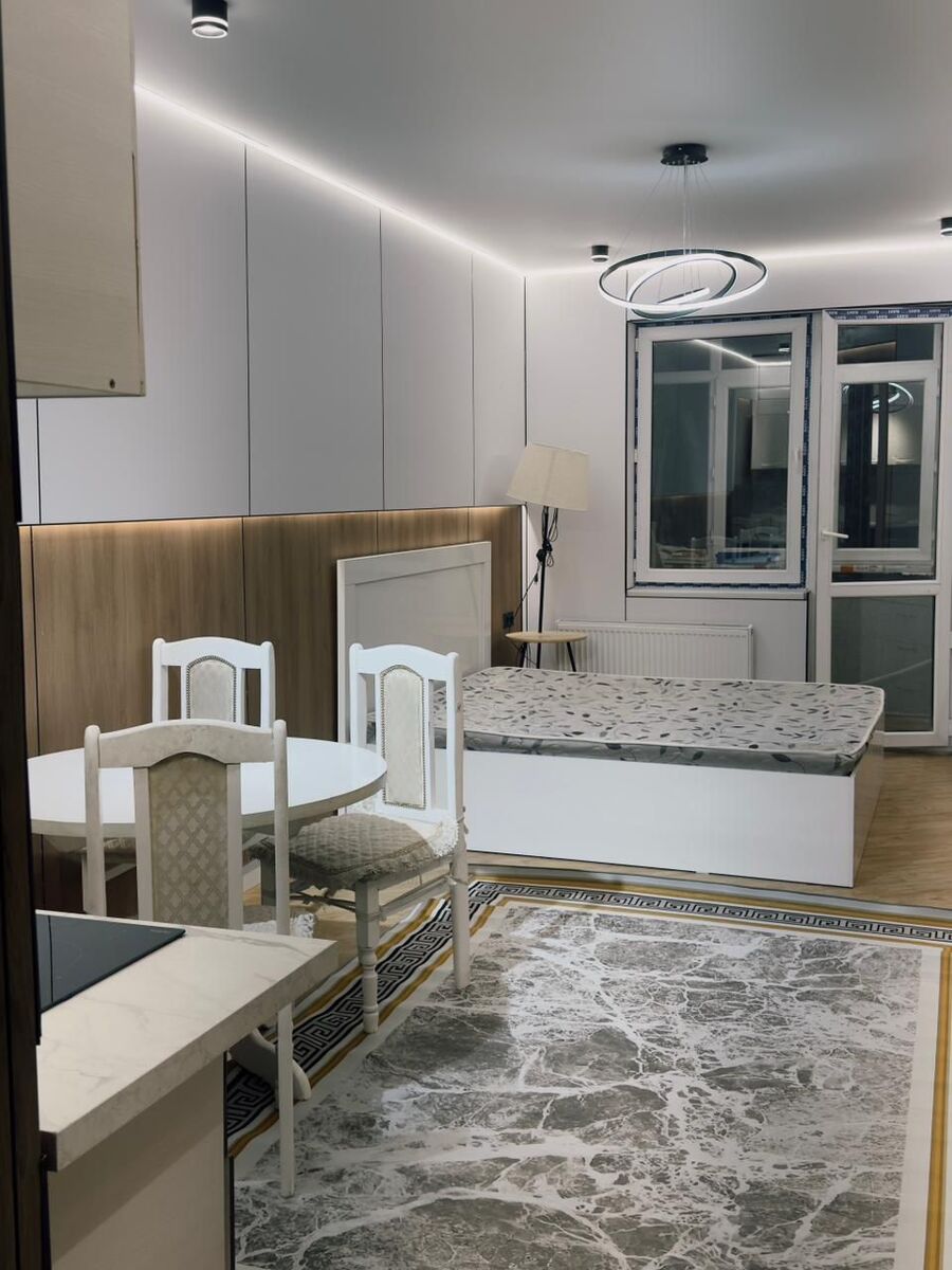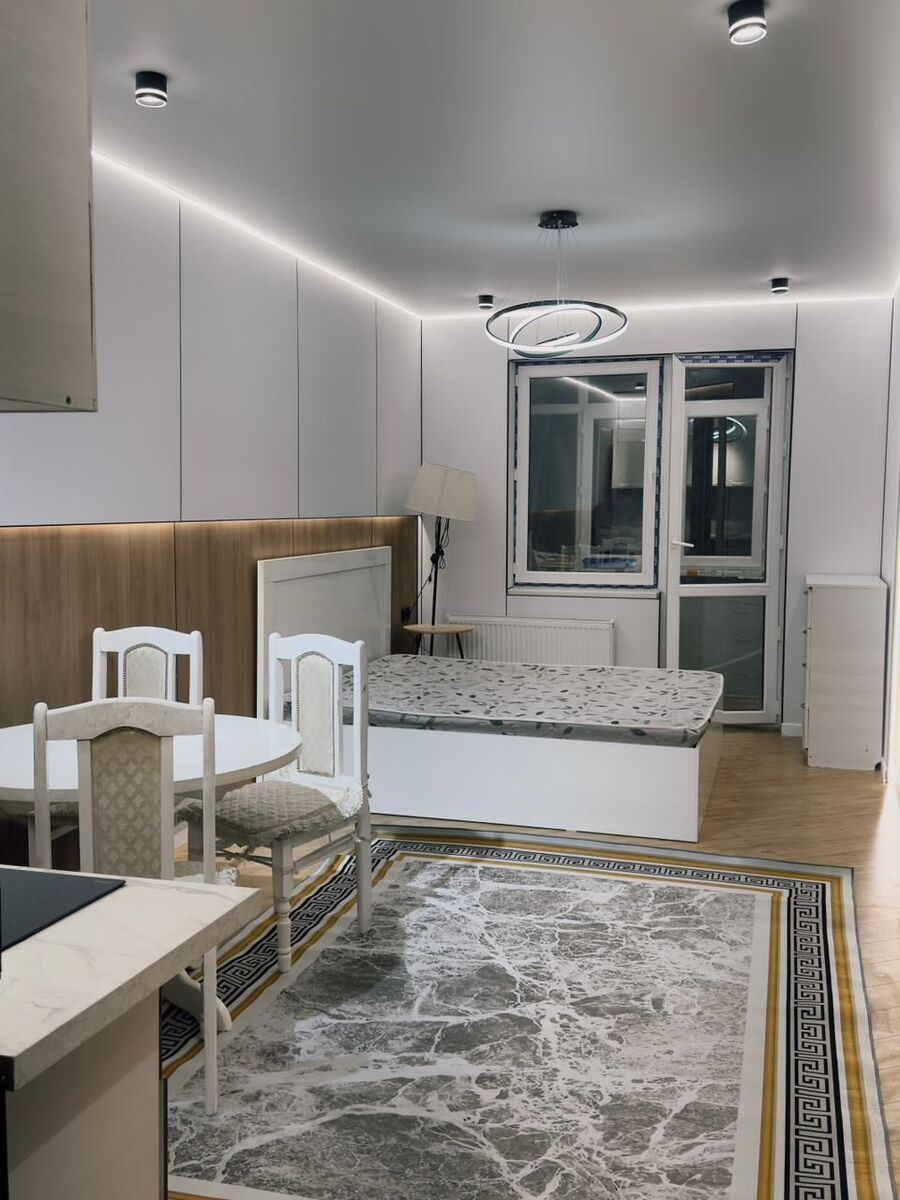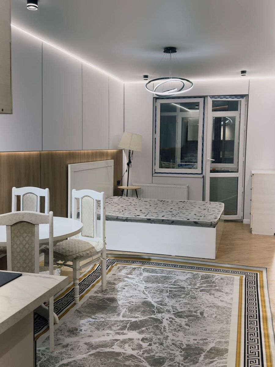 Окна во двор, полностью мебелировано, с дизайнерским ремонтом, современный стиль, шумо изолированный. Прекрасная панорама, город как на ладони. Не угловая. Квартира внутри в живую очень большая для кухни студии!
