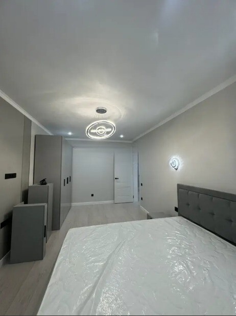 Кровать с под’емным механизмом 1, 80 на 2, Прикроватные тумбы, 4- дверный шкаф, тв зона, навесные полки, косметический стол с зеркалом, раскладной диван, гардеробная.