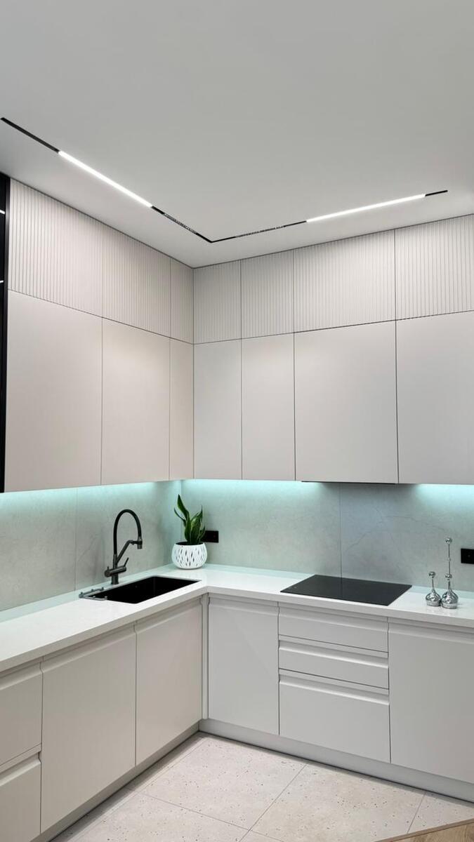Свежий ремонт в спокойных, нейтральных тонах с подсветкой — ничего переделывать не нужно, заезжай и живи.