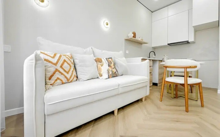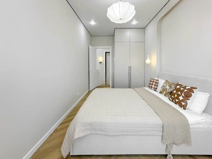 • Пол — качественный ламинат: елочка, современное покрытие, устойчивое к влаге и износу.