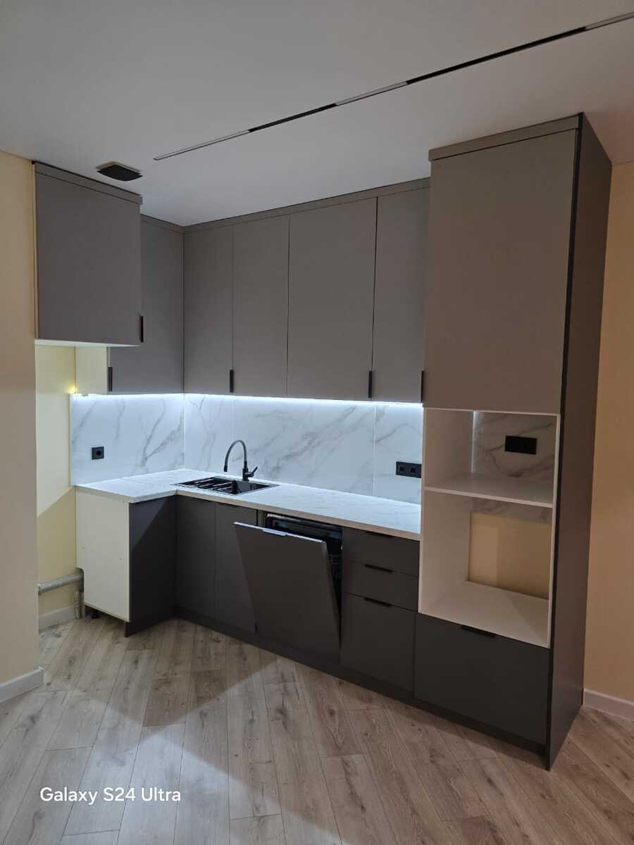 в кухне-студии — гарнитур с посудомоечной машиной, раковиной со смесителем и подсветкой.