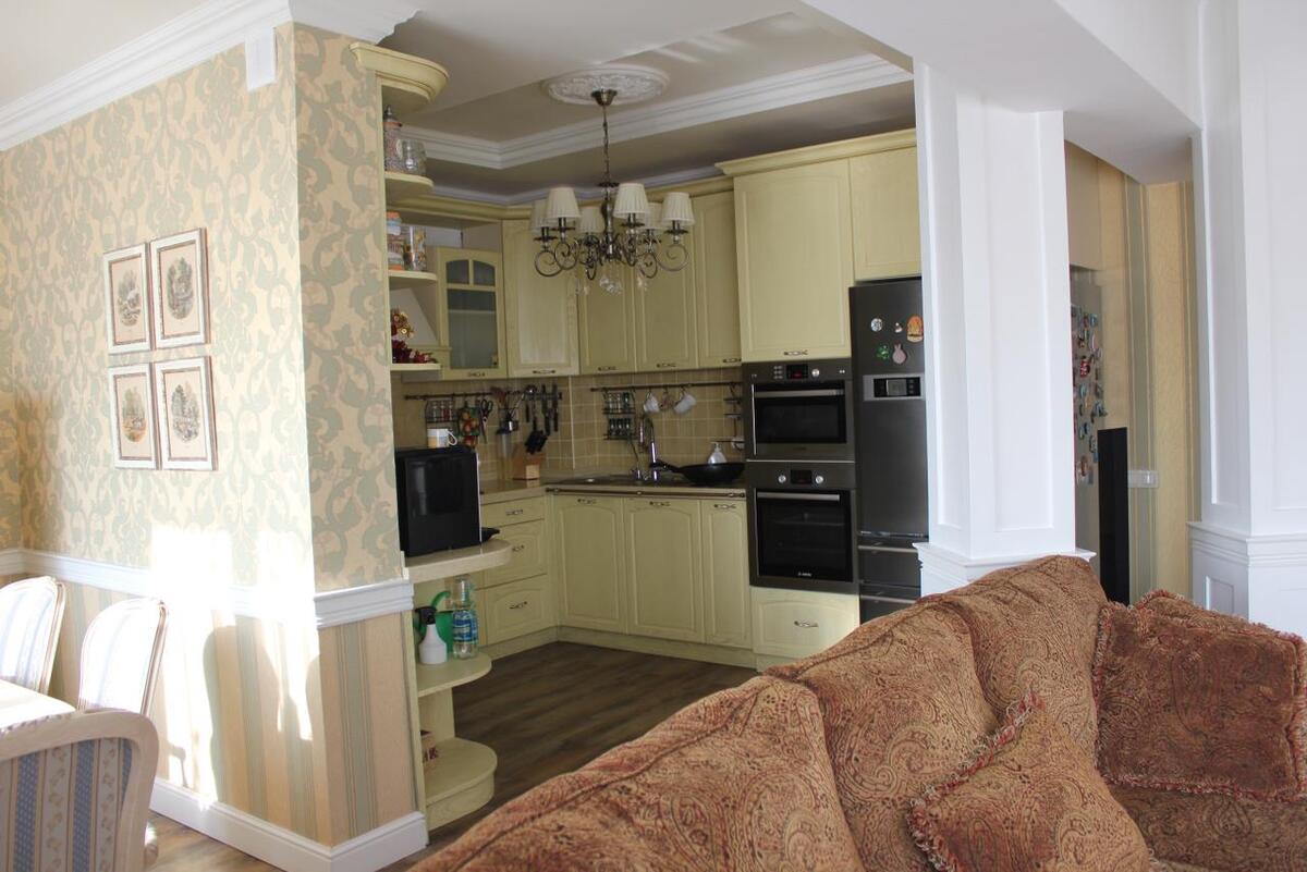 Просторная гостиная объединена со столовой и кухонной зоной.